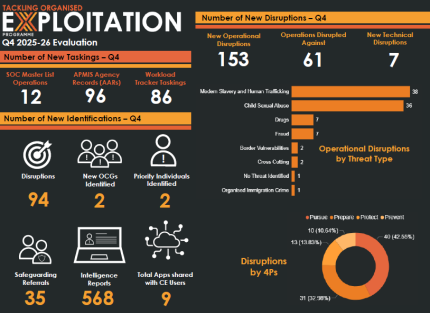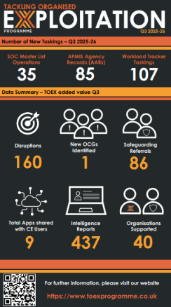 The infographic demonstrates the impact of the TOEX programme on the identification, prioritisation and disruption of organised exploitation offenders and protection of those they would exploit. In addition, it highlights how effective the centrally coordinated, regionally delivered TOEX model, through a case study, and provides more detail around the performance of the centrally delivered TOEX Capabilities Environment in terms of costs incurred and savings made.